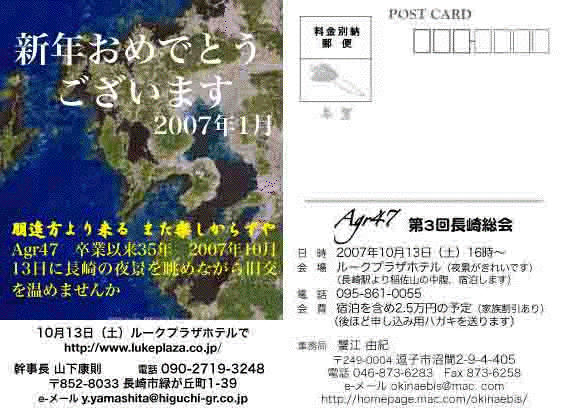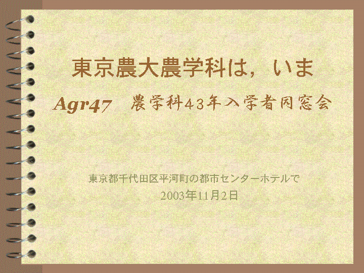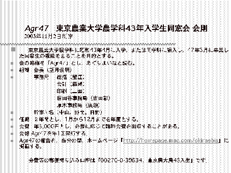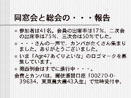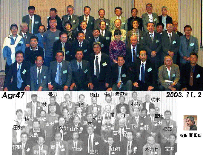 2003年11月2日に開かれた第2回同窓会で総会が開催され,同窓会が正式に発足しました。総会の決議で,名称をAgr47(あぐりよいな)とし,次回を2005年9月に京都でのの開催を予定しています。年会費は3000円と決まりました。総会報告と会則および出席者の写真を以下に示します。
