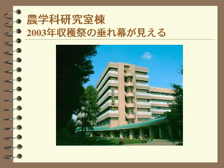 2005年の農大収穫祭は10月28日から10月31日でした。農大のホームページ[http://www.nodai.ac.jp/]でを見られます。Agr47のホームページアドレスにミスプリントがありました。正しくはhttp://homepage.mac.com/okinaebis/Agr47.htmlに修正して下さい。