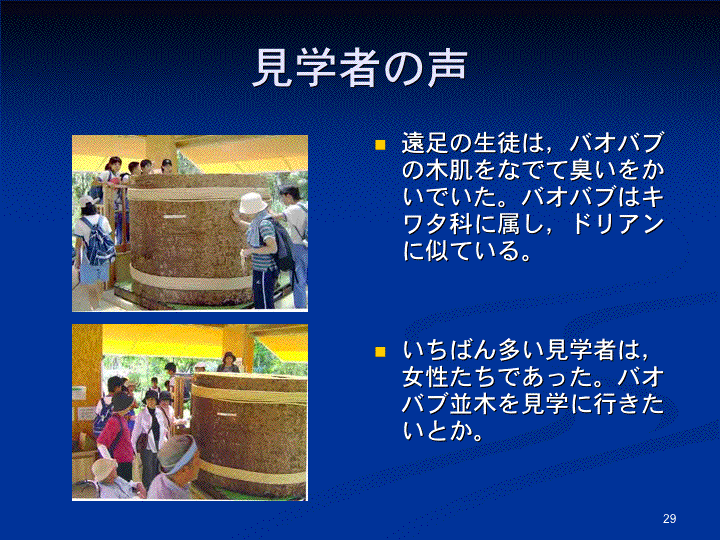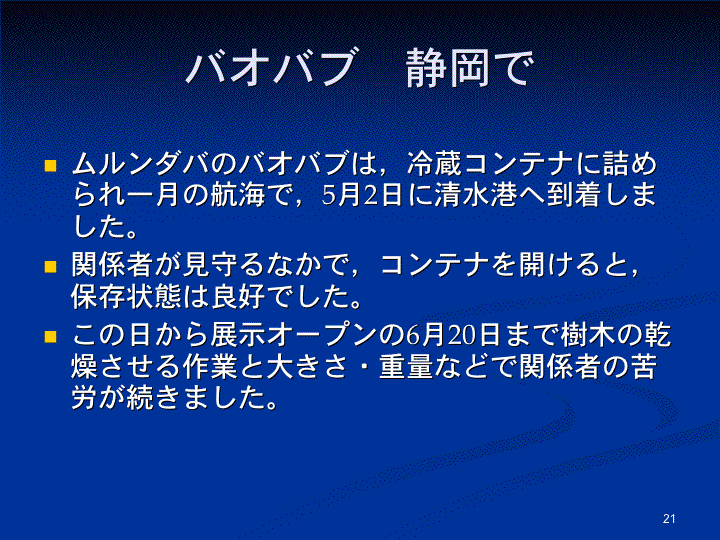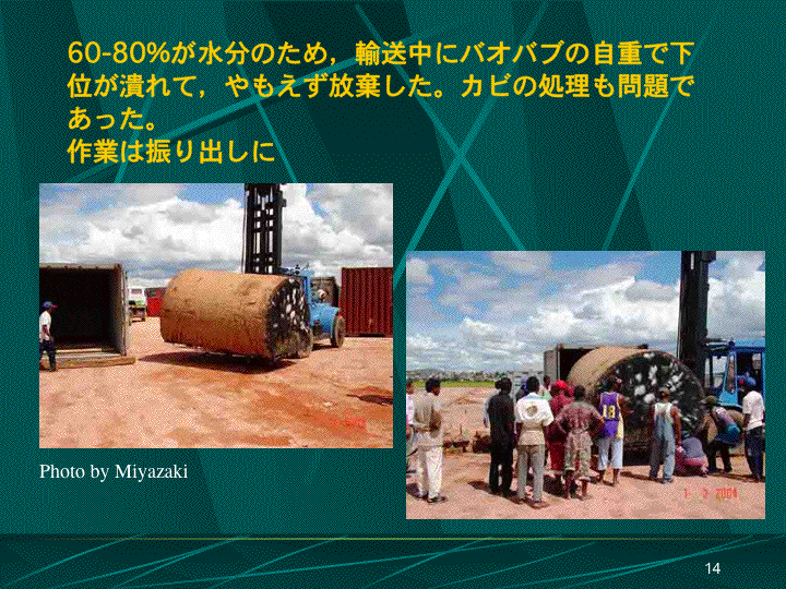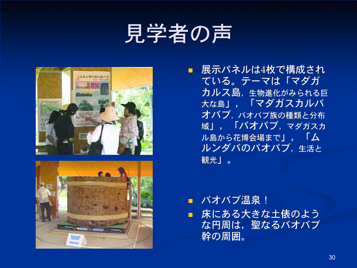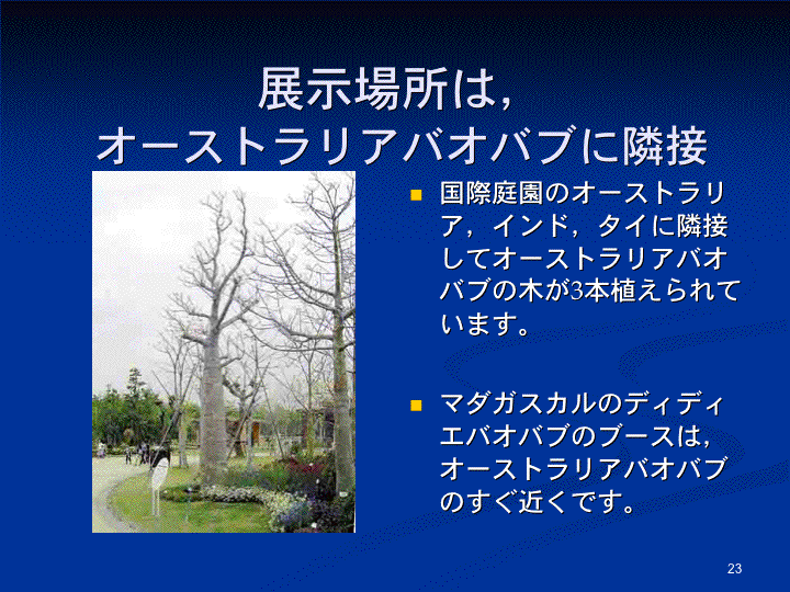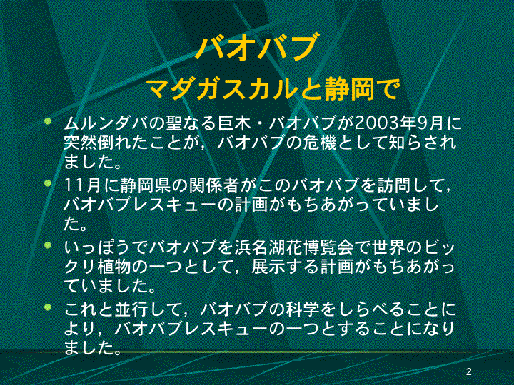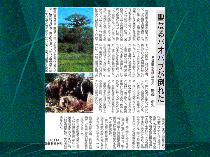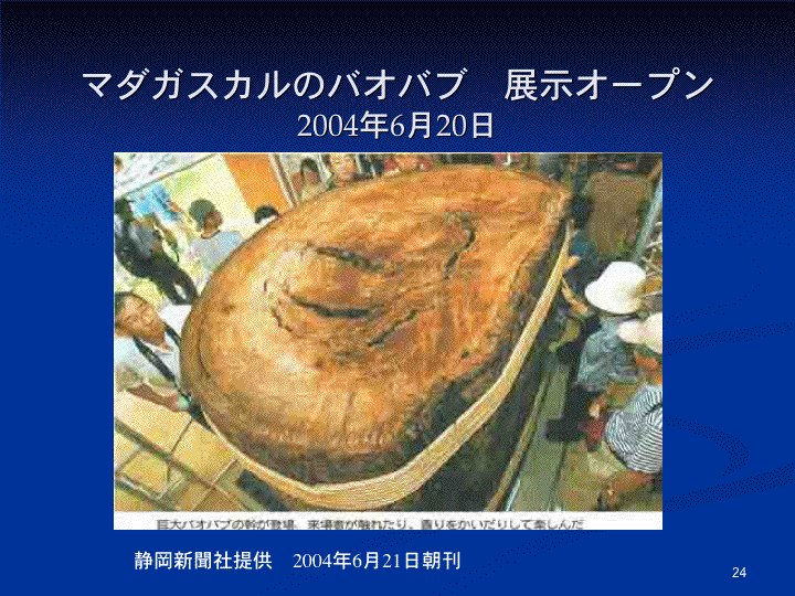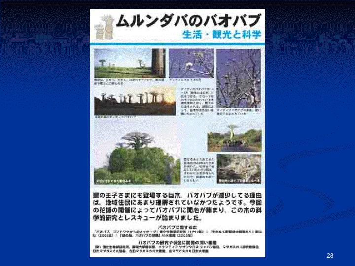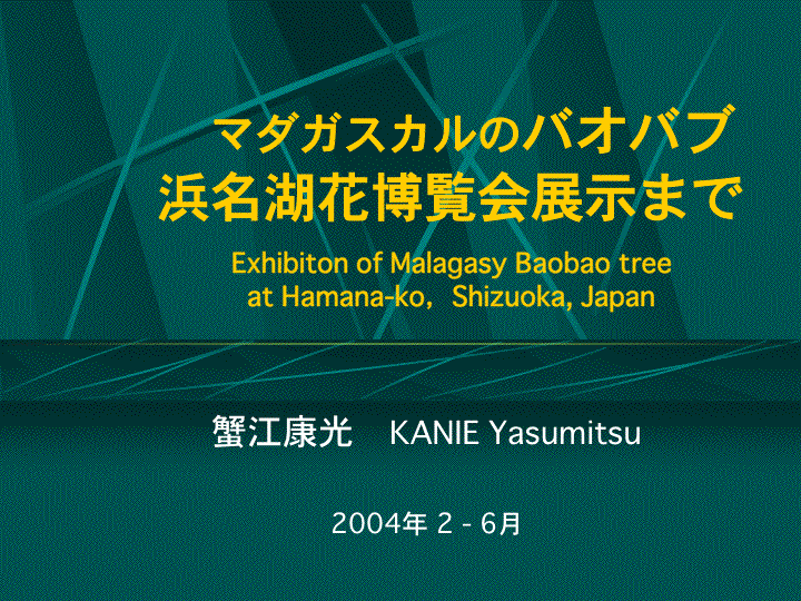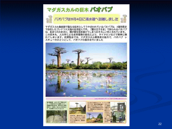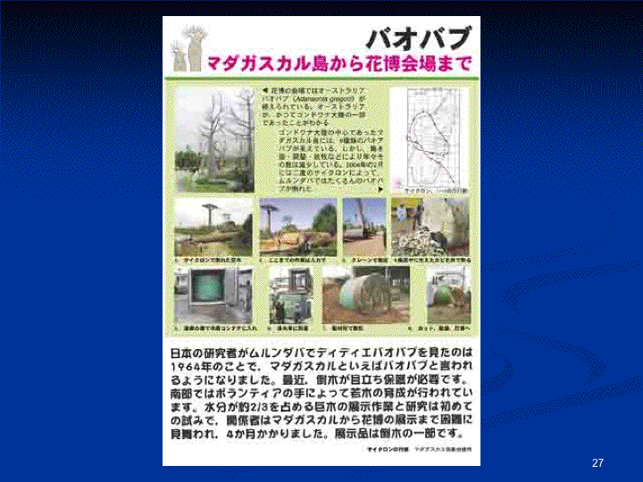 花博覧会は2004年10月に終了しました。ここではマダガスカルでの交渉,搬出,そして博覧会での展示までの過程を31枚のスライドで報告します。
